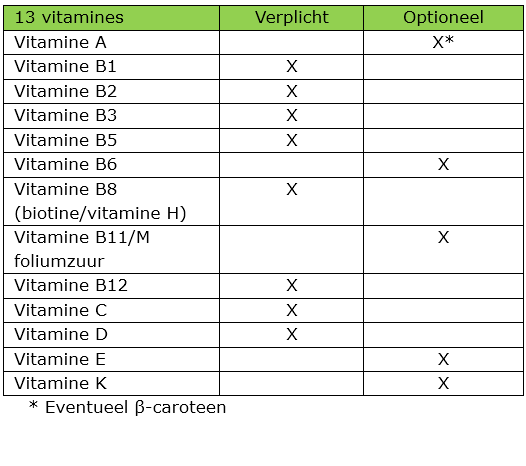 Verplichte en optionele vitamines en mineralen bij ‘compleet’, ‘alles-in-één’ of ‘A tot Z’.